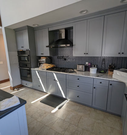 This home was rebuilt bigger and better after a tragical fire. Together we assessed what was to achieve a rebuilt dream to include a larger cook's kitchen, open plan living, lofty ceilings, first floor laundry and primary suite. One request was to upgrade the staircase to the second floor as the previous spiral staircase was tight and difficult for moving furniture; with this changing we also prioritized a small loft. The ultimate upgrade is the tripped out basement entertainment space including home bar, pool table, golf simulator and full bathroom.