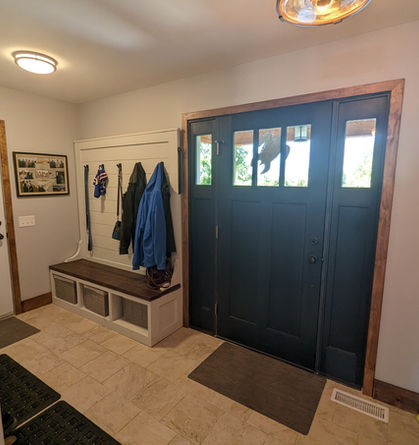 To better accommodate multigenerational accessible living and the desire to move toward a more sustainable lifestyle, we designed this passive house* with its 14” thick exterior walls, strategic roof overhangs, and European style windows to appear as a traditional house. The home owners were both excited to build to better accommodate the needs of their son, who uses a wheelchair, and their 90 year old father. Her goal was to create something that felt homey while he wanted a truly self sustaining homestead; together we figured out what would work for each of them! Our full architectural and electrical services were coupled with information from Passive House and Energy consultants and builders, and site harvested timbers result in a stunning, cozy feeling house with room for them all. In addition to 3 different primary suites to fully accommodate the family, we have a library nook, a lofted meditation area, generous mudroom, office, family room for football watching; all infused with much natural light.
